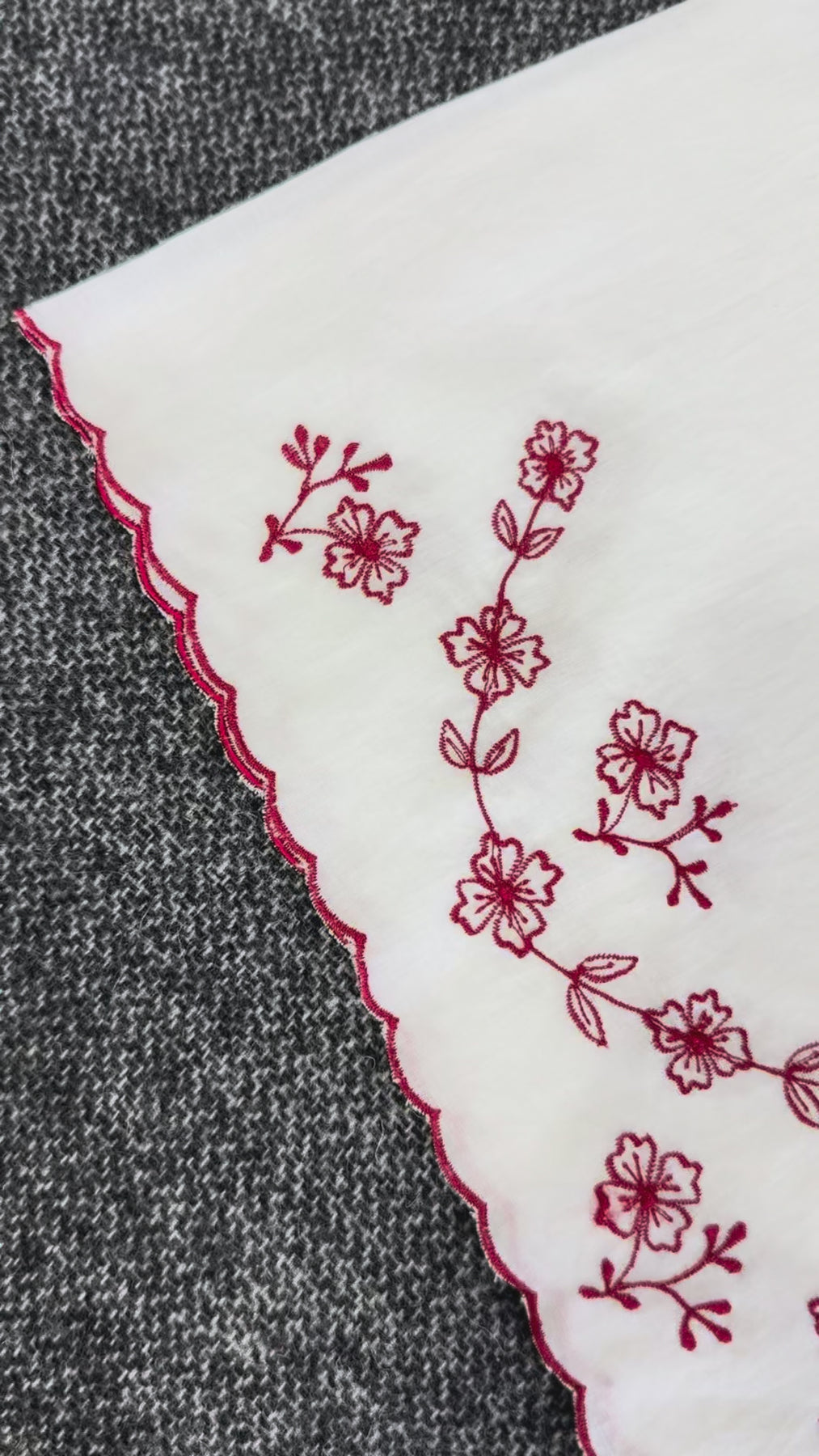 This embroidered headscarf features a delicate scalloped edge with dark red floral embroidery stitched into alternate corners. A subtle pop of colour that adds warmth and character without feeling busy. Easy, thoughtful, and quietly elevated.