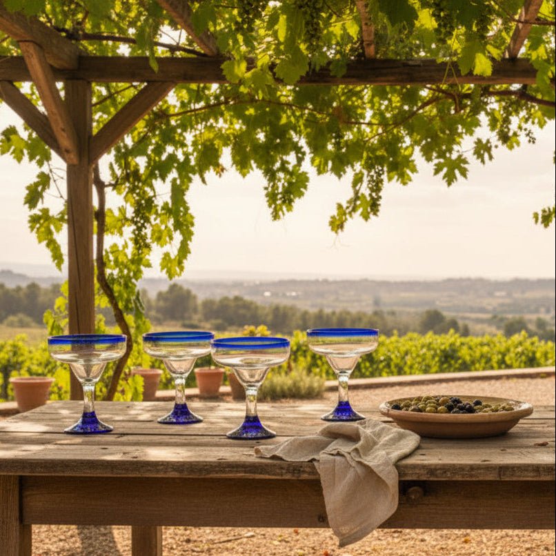 These Mexican margarita glasses are handcrafted from recycled glass, and finished with a classic cobalt blue rim. Thick, weighty and beautifully imperfect, they’re the kind of glasses that instantly set the tone - whether you’re pouring margaritas, agua fresca or a simple soda with lime.