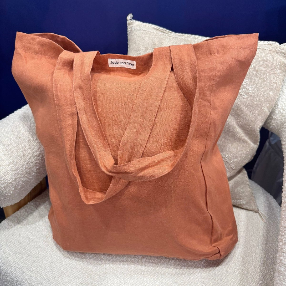 Made from 100% linen in a warm burnt clay tone, it has a natural texture that softens over time while still holding its shape. The fabric feels strong and substantial in hand, giving you a tote bag that doesn’t sag or lose structure after a few uses.
